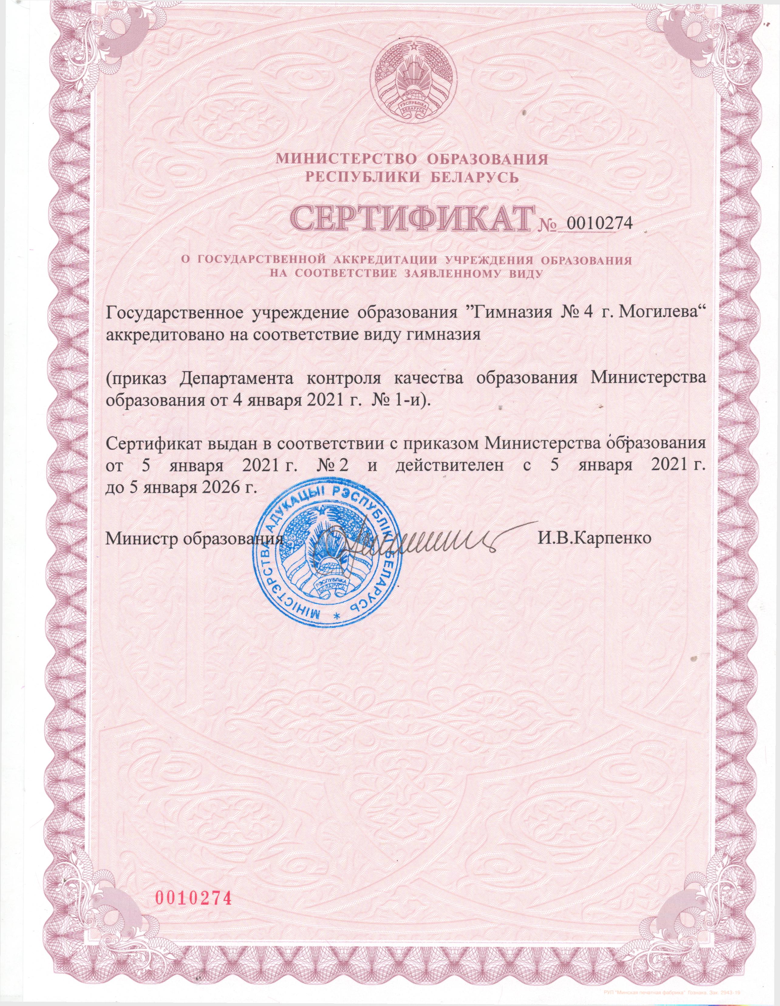 Департамент контроля качества образования Министерства образования Республики Беларусь подтвердил государственную аккредитацию государственного учреждения образования "Гимназия №4 г. Могилева" на соответствие виду гимназии с выдачей сертификата о государственной аккредитации