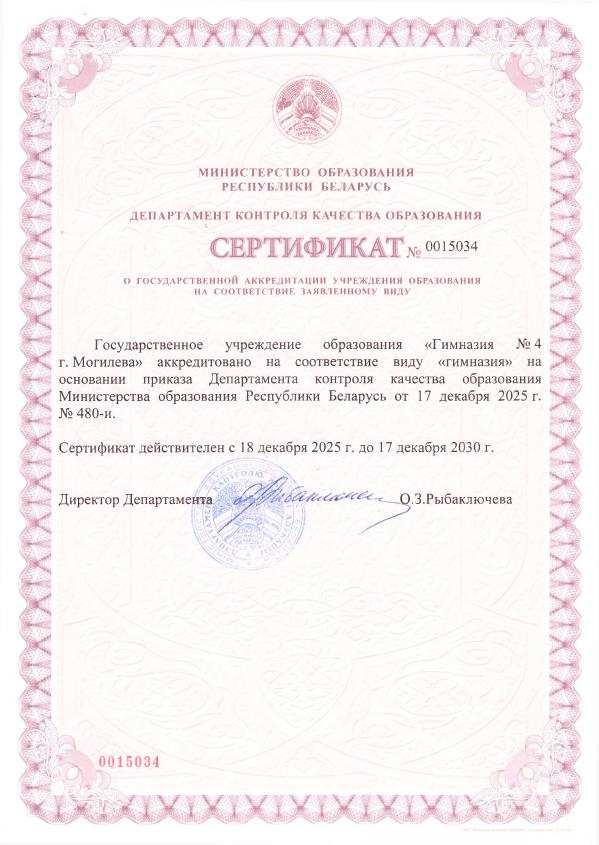 Департамент контроля качества образования Министерства образования Республики Беларусь подтвердил государственную аккредитацию государственного учреждения образования "Гимназия №4 г. Могилева" на соответствие виду гимназии с выдачей сертификата о государственной аккредитации