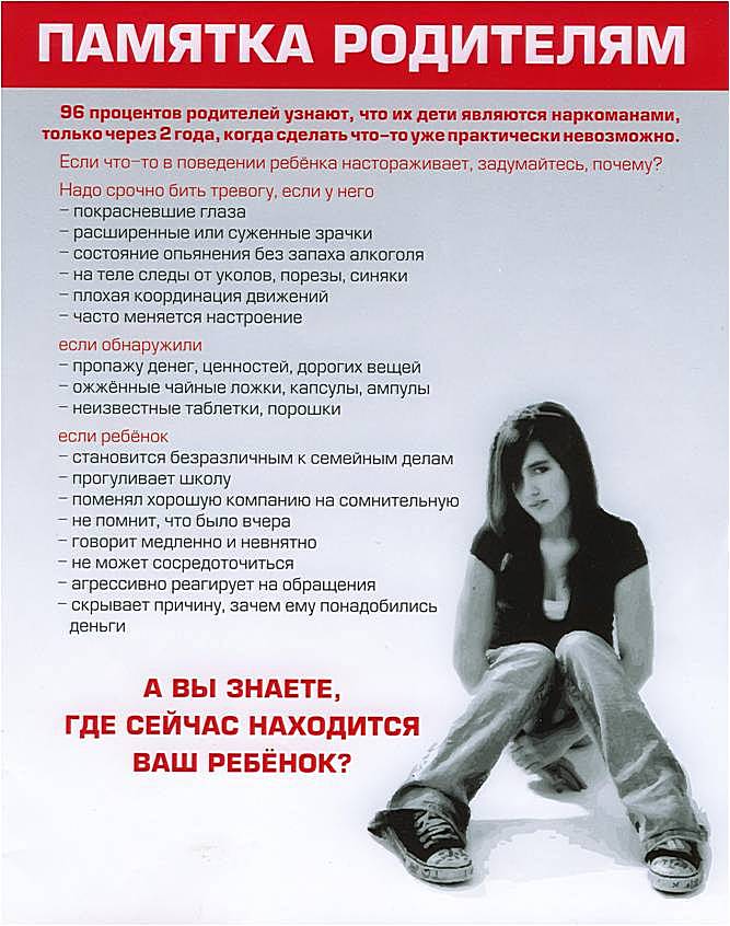 Особенно будьте бдительны в отношении друзей вашего ребенка. Узнайте о них как можно больше. Постарайтесь увидеть или познакомиться с их родителями (например, на родительском собрании в школе). В любом случае не стесняйтесь говорить с детьми о проблемах, с которыми может столкнуться человек, потребляющий наркотики (медицинскими, нравственно-этическими, юридическими и т.п.).