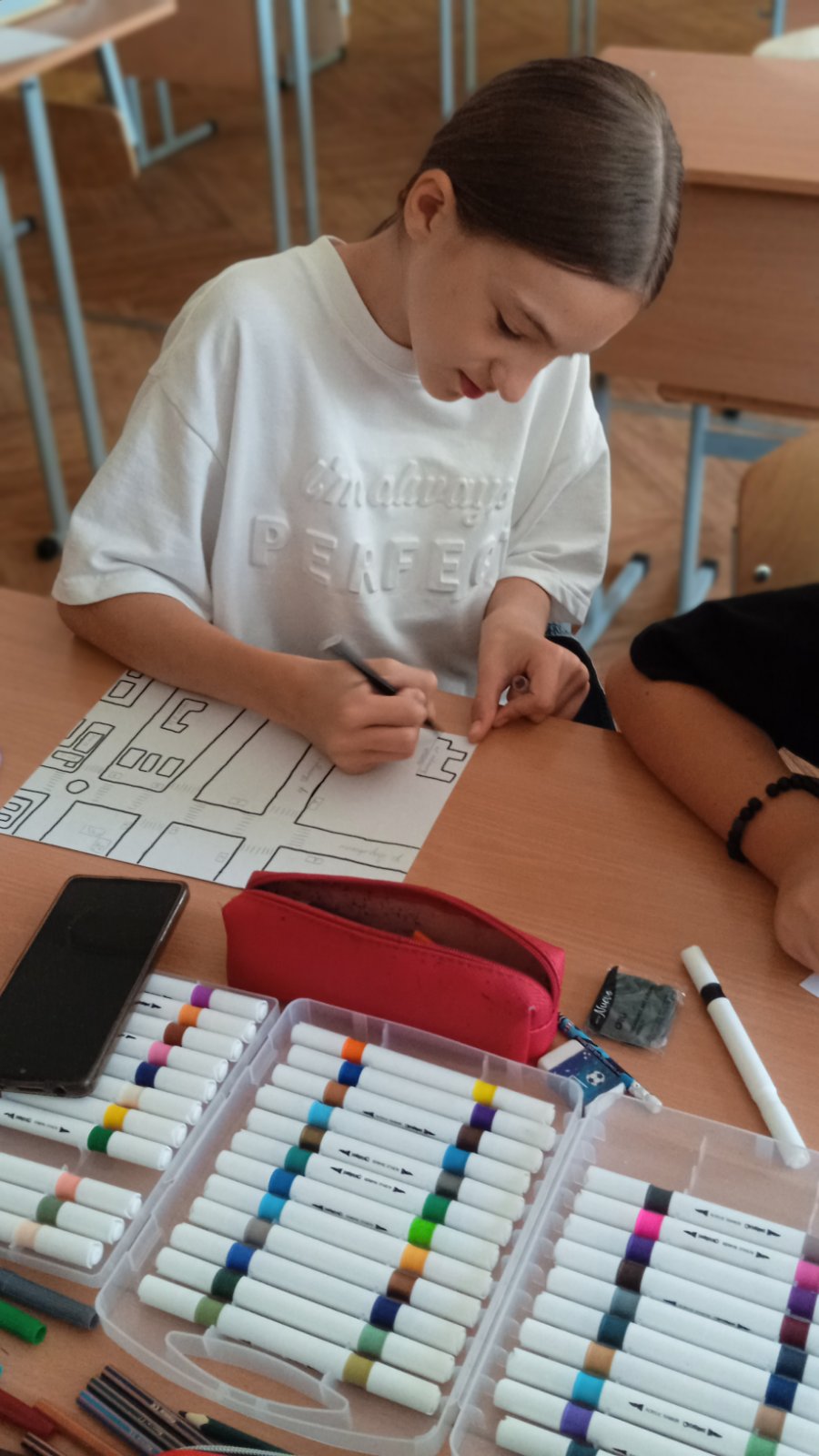 В 5"А" классе в субботу 06.09.2025 был час творчества " Мой путь в гимназию"! Пришедшие на мероприятие пятиклассники повторили правила дорожного движения и изобразили схемы своего движения в гимназию и обратно домой! Час творчества оказался продолжительным, т.к. надо было представить себя и чертежником, и художником, и пешеходом!