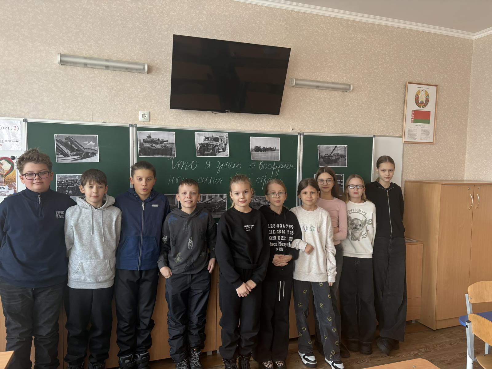 В 5 б классе 07.02 прошла беседа « Что я знаю о вооруженных силах своей страны». Дети узнали сколько человек составляет белорусская армия, когда призывают в армию , какое есть оружие и техника.