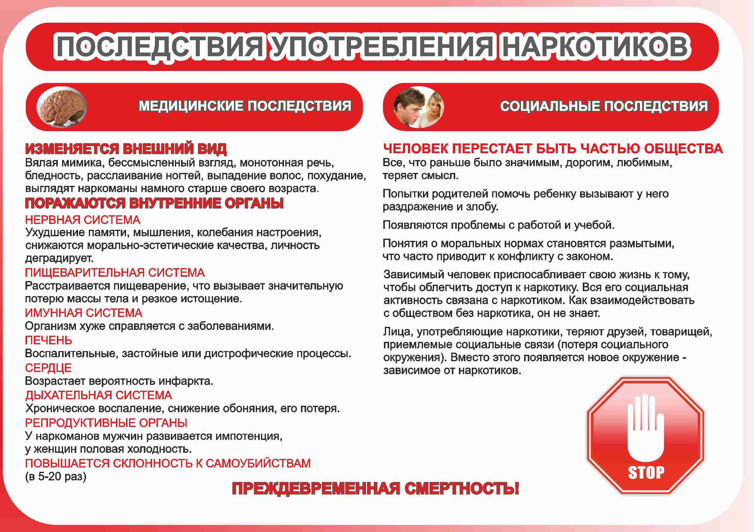 Ответ: систематическое употребление наркотиков приводит к резкому истощению организма, изменению обмена веществ, психологическим расстройствам, ухудшению памяти, появлению стойких бредовых идей, к проявлениям, подобным шизофрении, деградации личности, бесплодию. Общая деградация личности наступает в 15—20 раз быстрее, чем при злоупотреблении алкоголем. Лечить от наркомании очень сложно, лучший вариант – даже не пробовать наркотики.